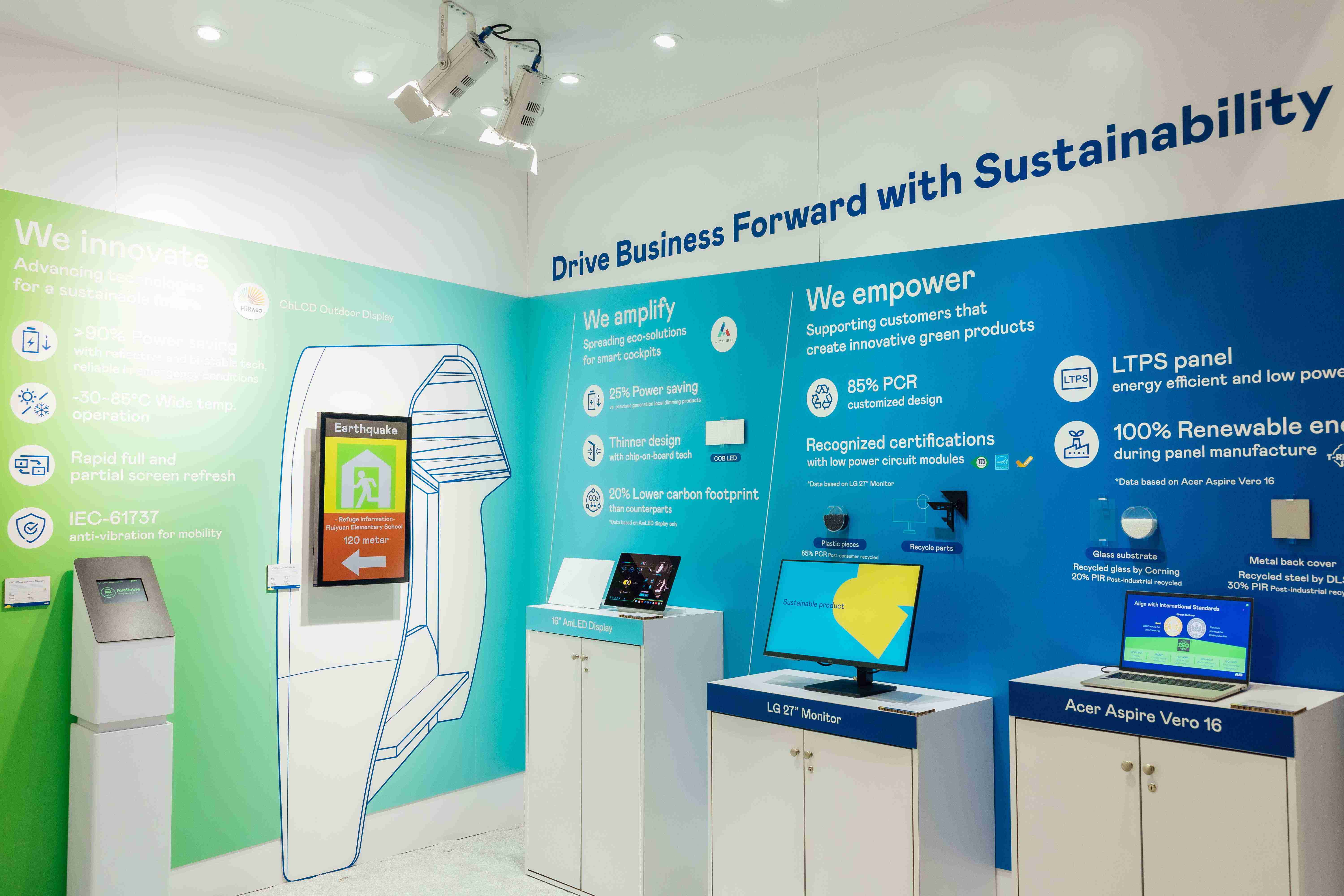 NG大舞台运用创新显示技术HiRaso胆固醇液晶双稳态技术达到显示零耗能、、、、扩大节能省电的AmLED显示技术应用于车用产品、、、、以再生的消费后回收(PCR)塑料及全绿电生产之面板,,,应用于笔电及萤幕,,增加绿色价值。。。