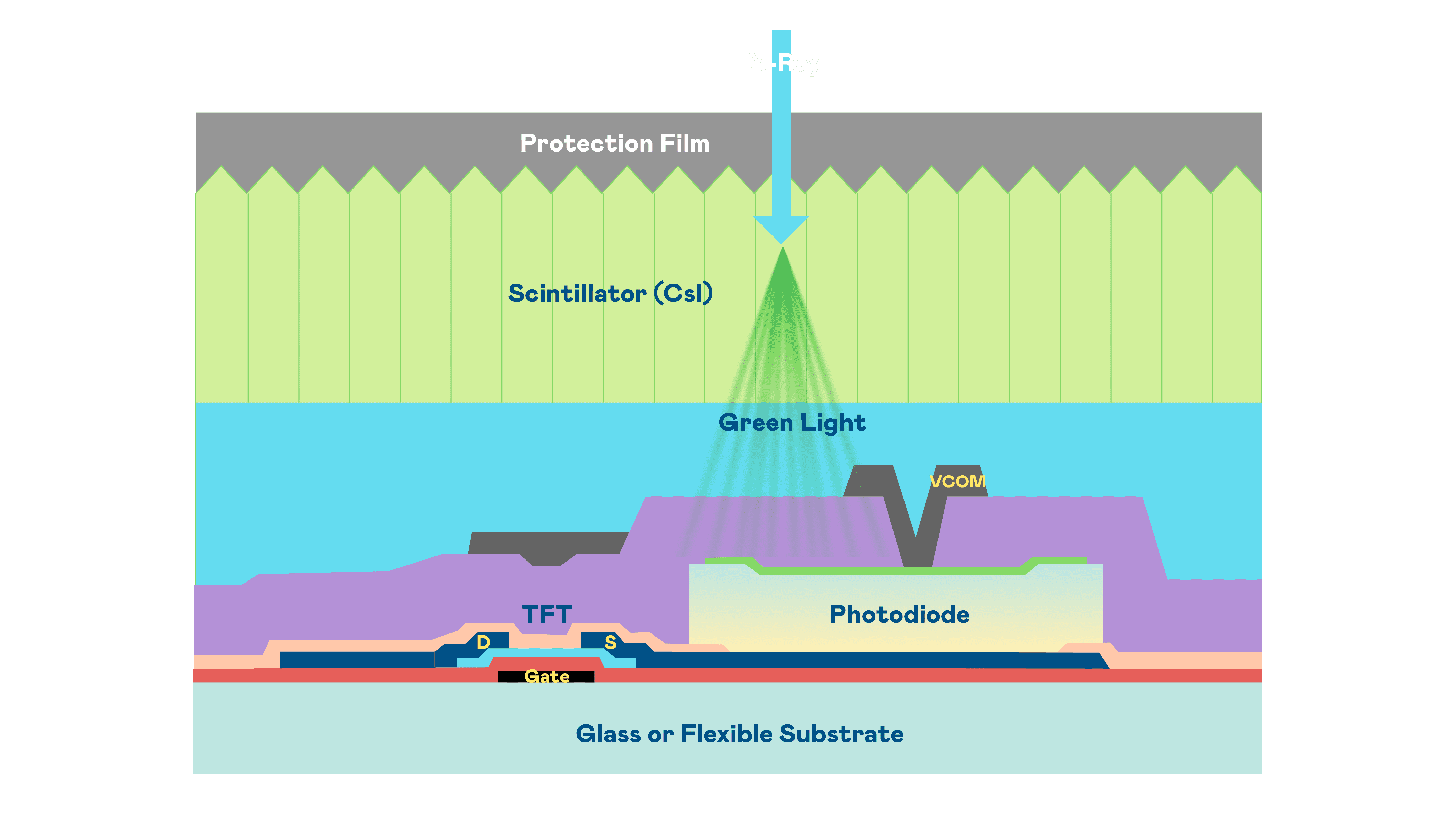 NG大舞台的X光影像感测阵列使用薄膜电晶体 (TFT) 作为每个像素的读取开关,,搭配光电二极体(Photodiode)的光电转换元件,,,用以感测X光影像讯号。。